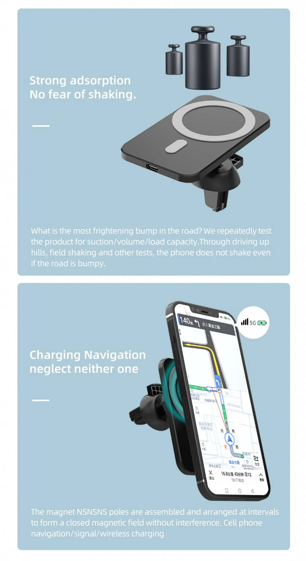 Our Magnetic car vent mounts wireless charger compatible with iPhone 13/13 Pro / 13 Pro Max / 13Mini/iPhone 12/12 Pro/Pro Max/Mini mag-safe case accessories magnet phone holder stand 15W fast charging car mount wireless charger provides safe and fast charging. Now you can charge your phone, glance at your GPS, receive hands-free calls and keep your eyes on the road.
