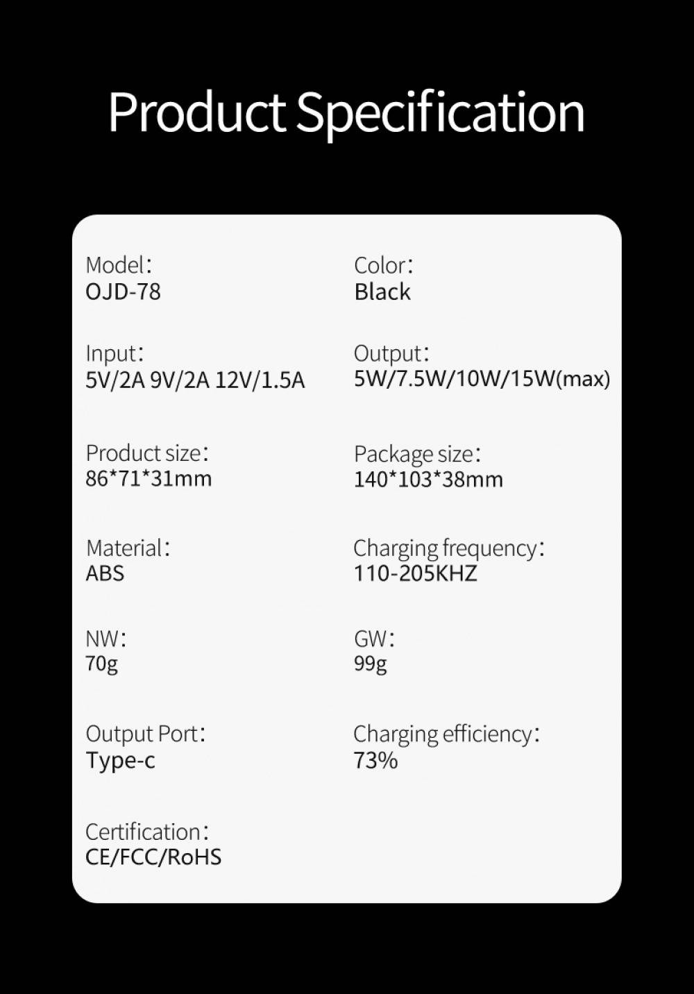 Output: Supports quick charge 15W, 10W, 7.5W and standard 5W