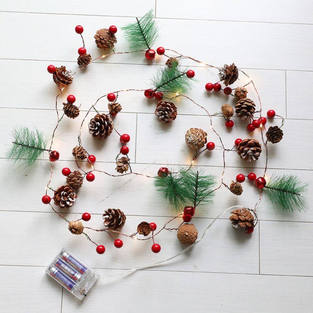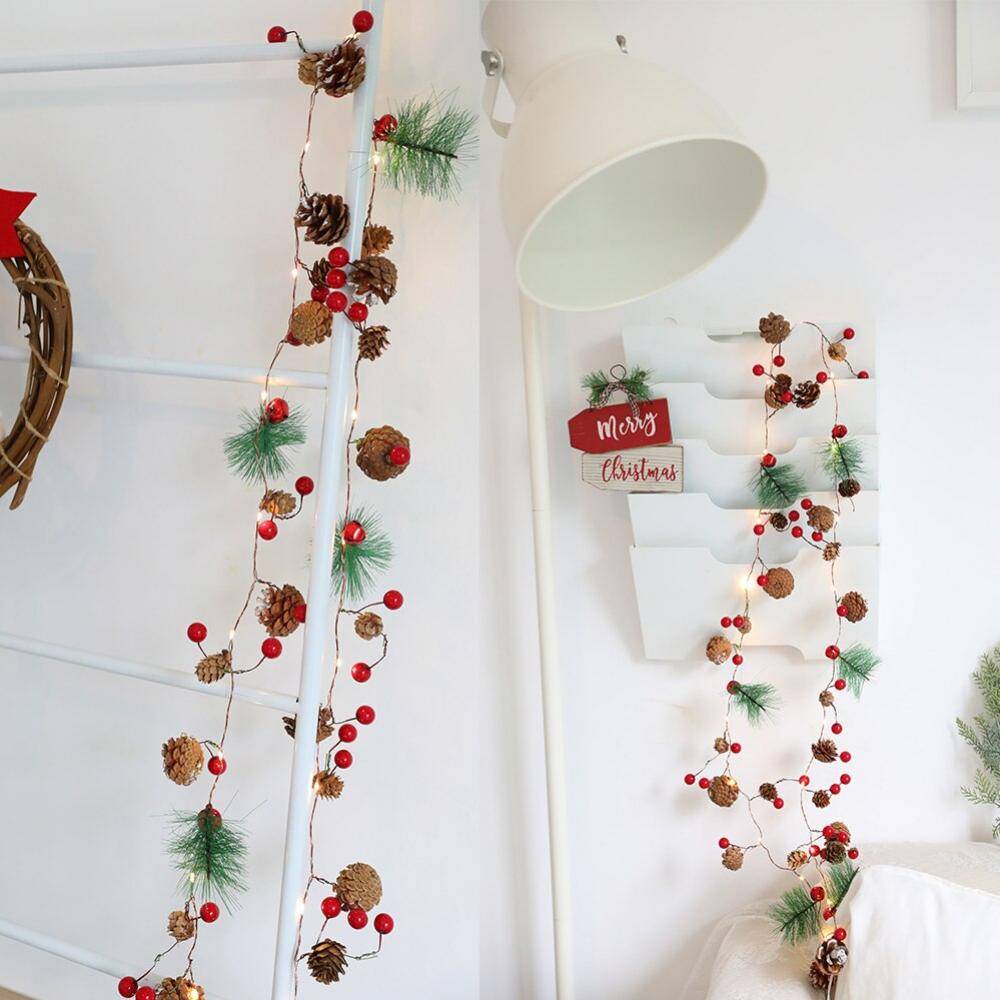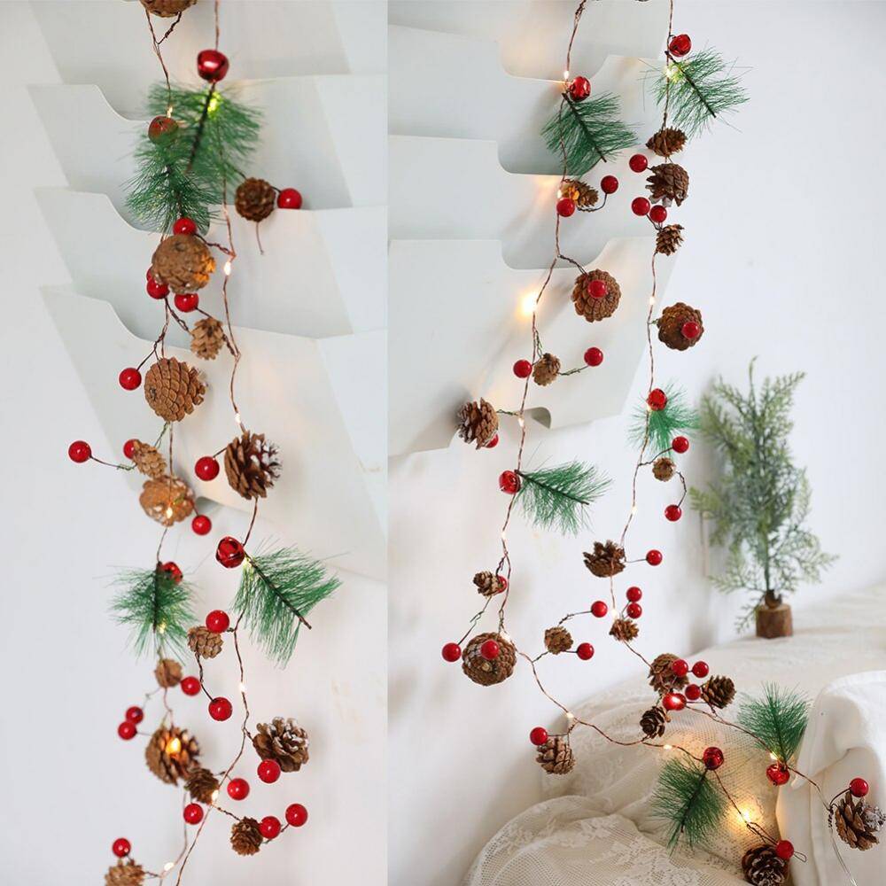 – A stunning long red berry and pinecone Christmas garland with battery operated LED lights.