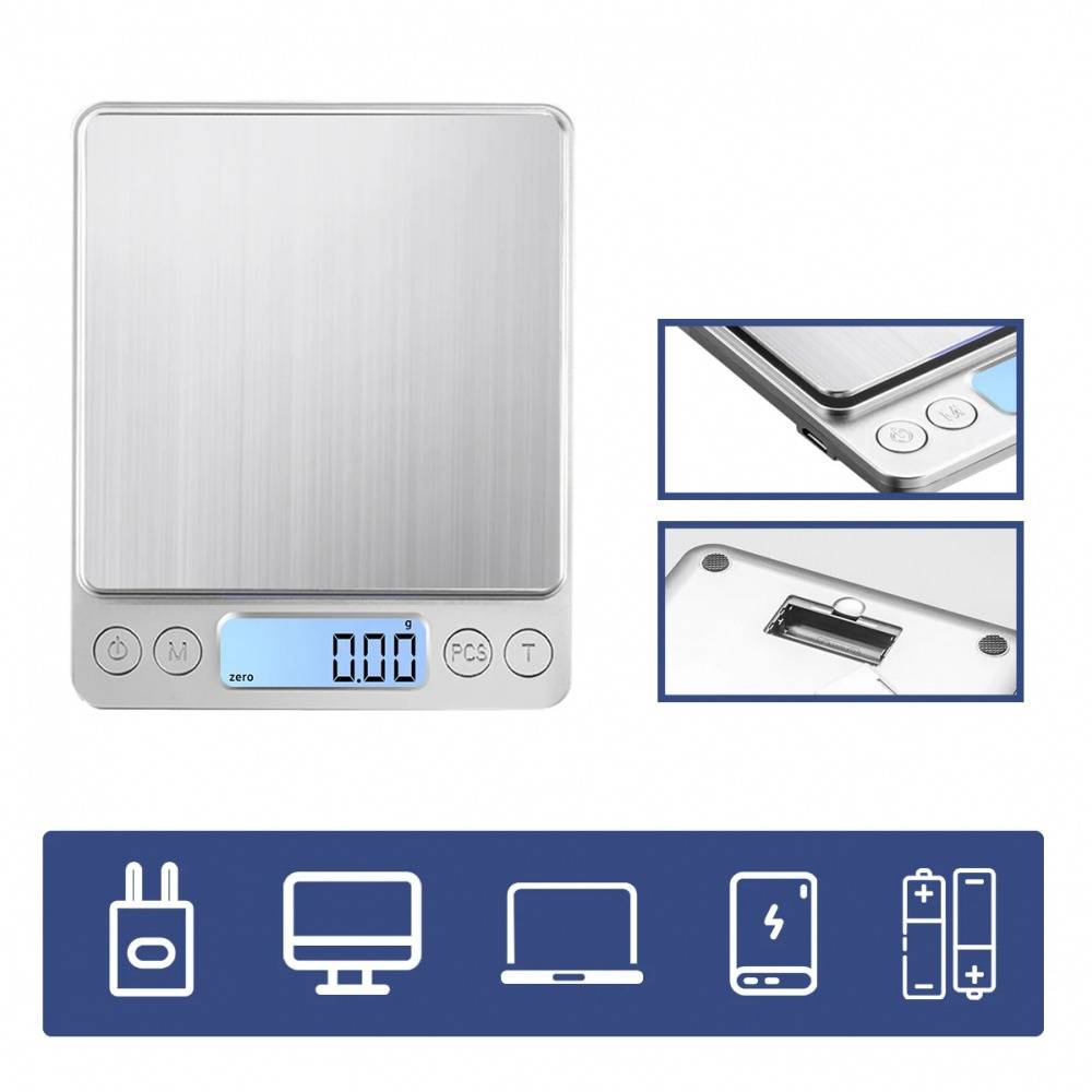 You can charge the electronic scale through desktop computers, notebooks, charging heads, mobile power and other charging devices, or you can use the USB charging cable for plug-in use. In addition, you can also use the attached 7-bit battery scale electronic power supply.