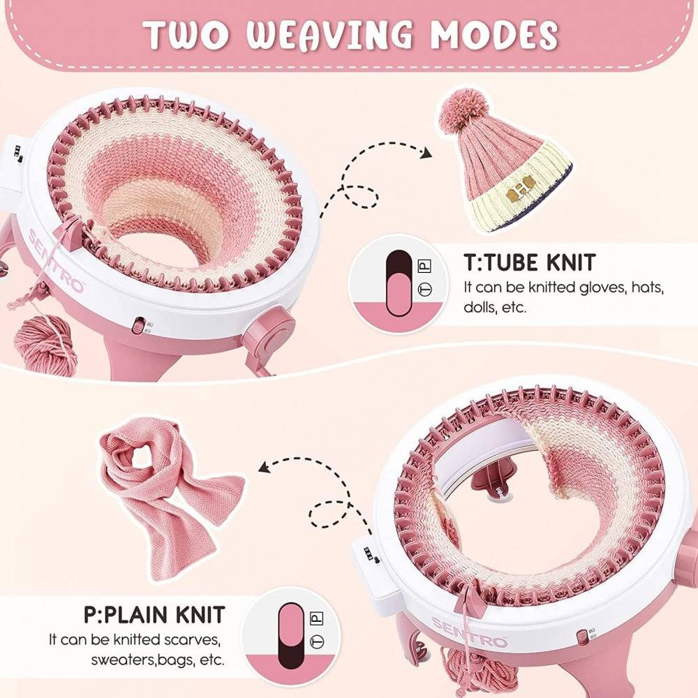 The Flat knitting mode reduces the number of needles, ideal for knitting scarves, bags, sweaters, and clothes. The Circular knitting mode provides a fixed number of stitches, perfect for making hats, scarves, socks, and more.