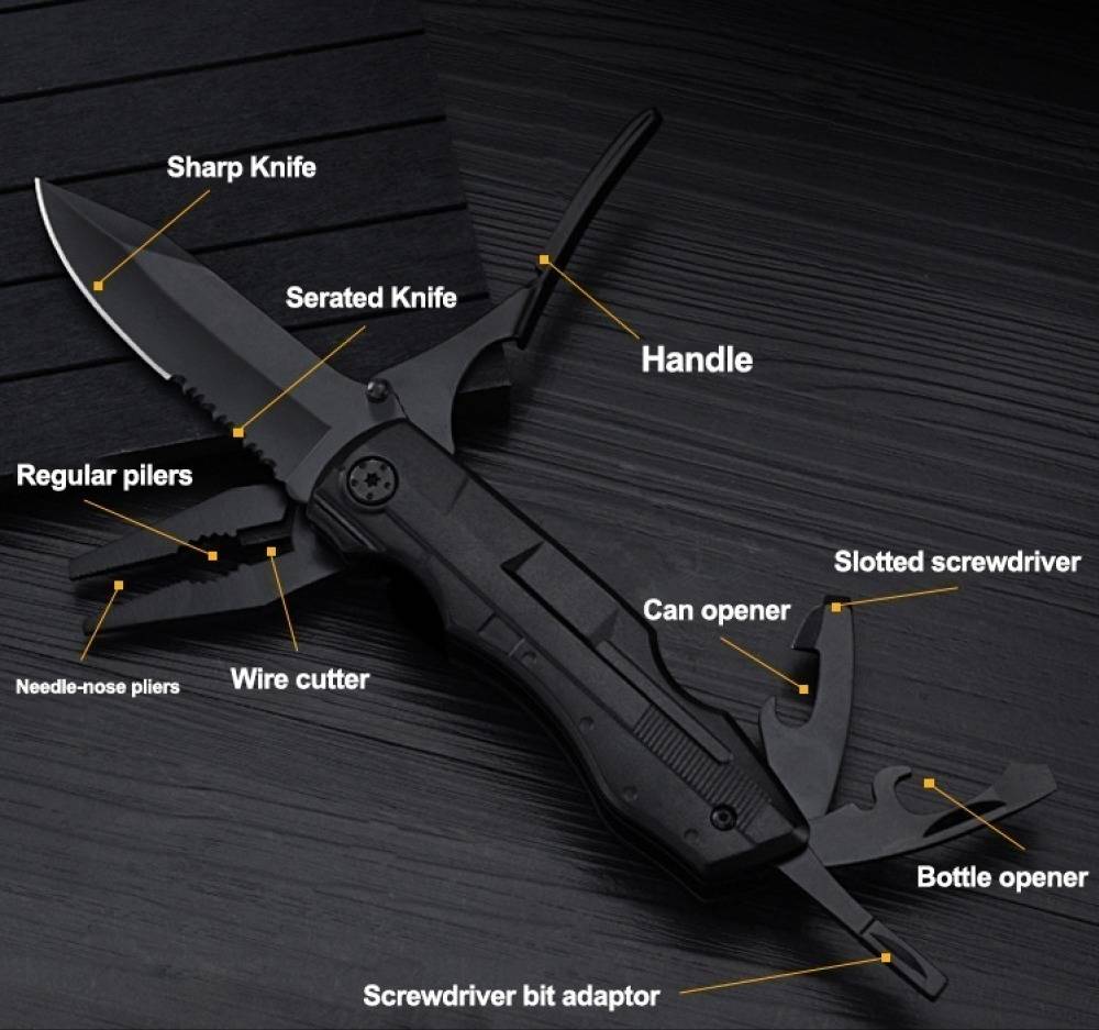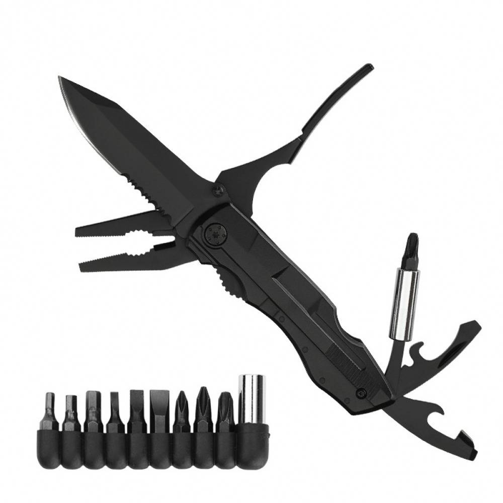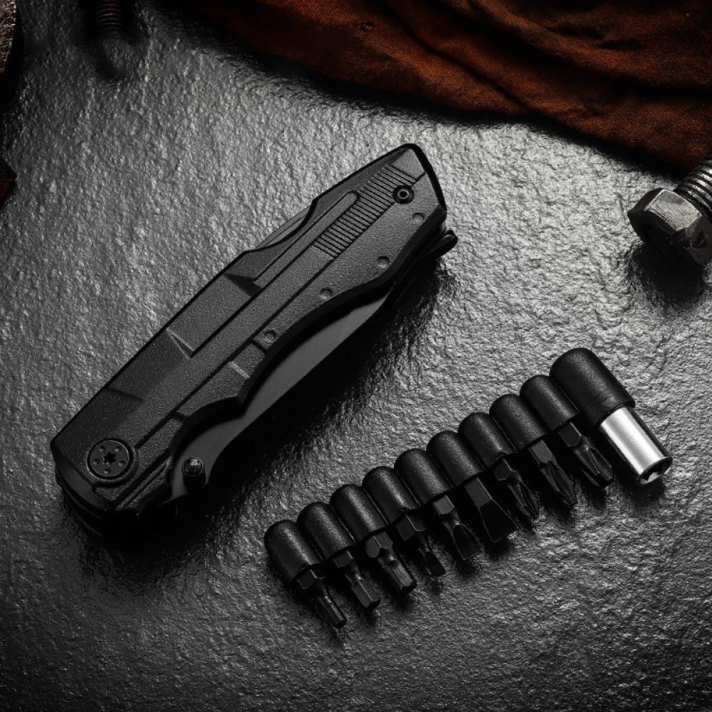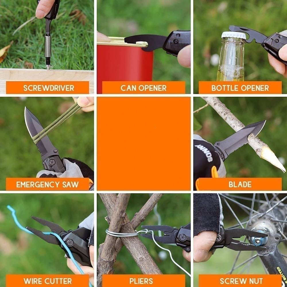 【Multifunctional& Cool】:Knife, pliers, can opener, bottle opener, and 9-in 1 screwdriver bit set is sure to provide a multi-purpose use. Whether hiking or camping with your family and friends, you will need this tool, which will bring you enough convenience.