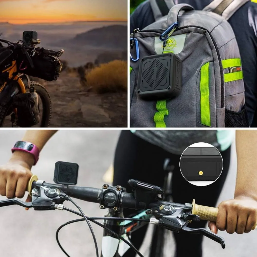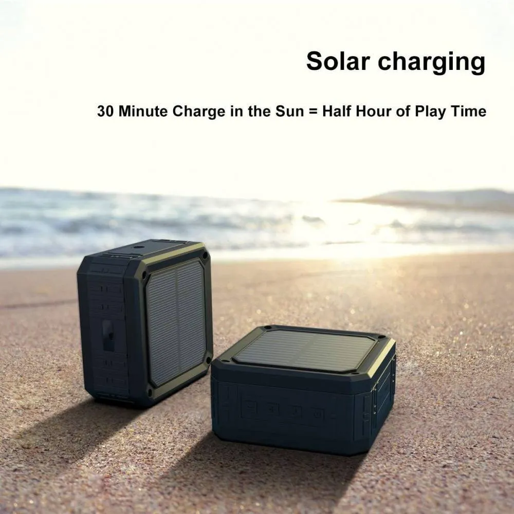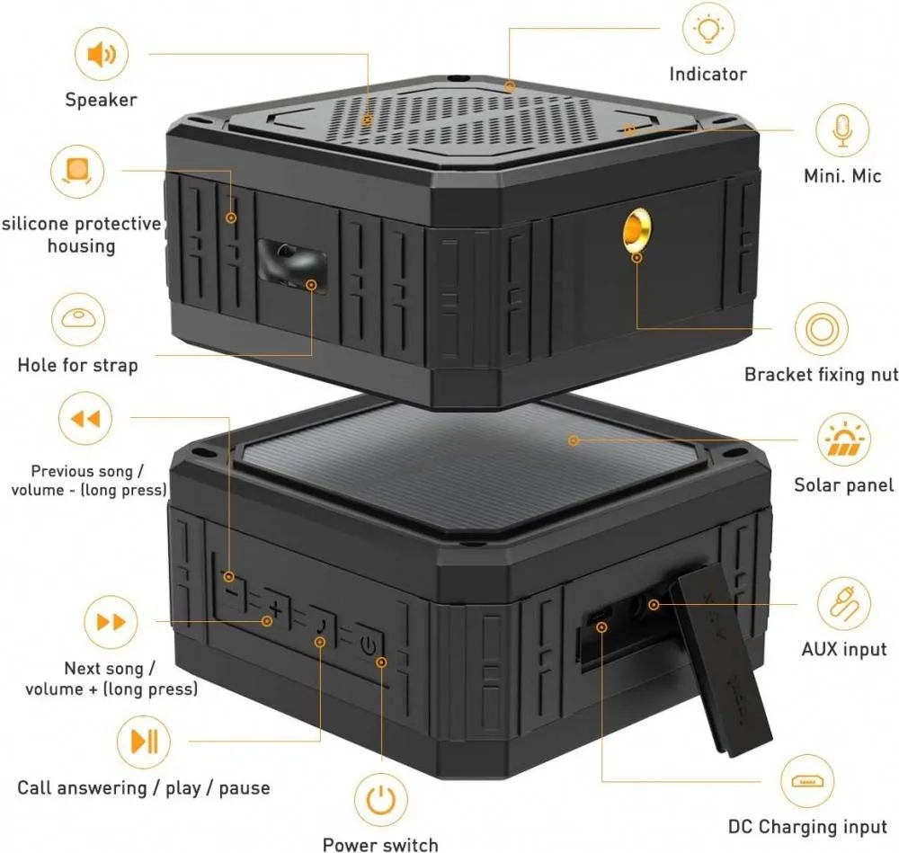 Solar Waterproof Bluetooth Speaker: This rugged solar speaker uses ABS+environmental silica gel, a Fully sealed design. silica gel is a highly elastic material, very durable. IPX6 waterproof/shockproof/dustproof, suits for pool, beach, shower etc outdoor activities. Even drops from a high place, it still maintains the original.
