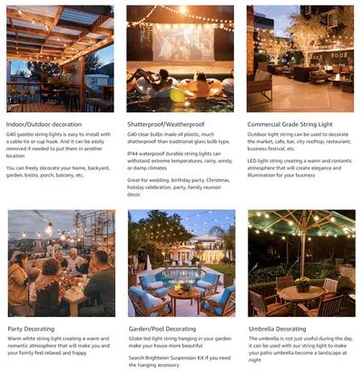 Energy-saving LEDs: The led string light total length of 7.6 meters, 25cm spacing between per led g40 bulbs (e12 base). Each led bulb is only 0.7w, which helps you save more electricity while giving out cosy illumination in your place. These bulbs are cool to touch after hours of use.