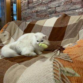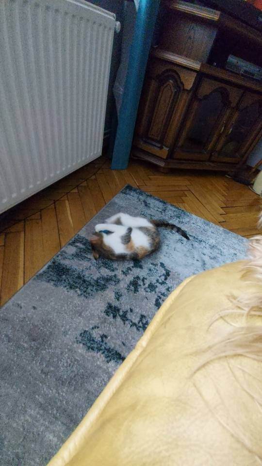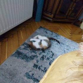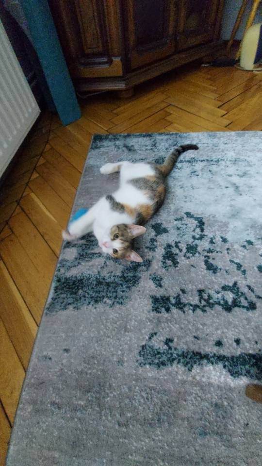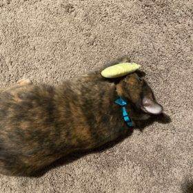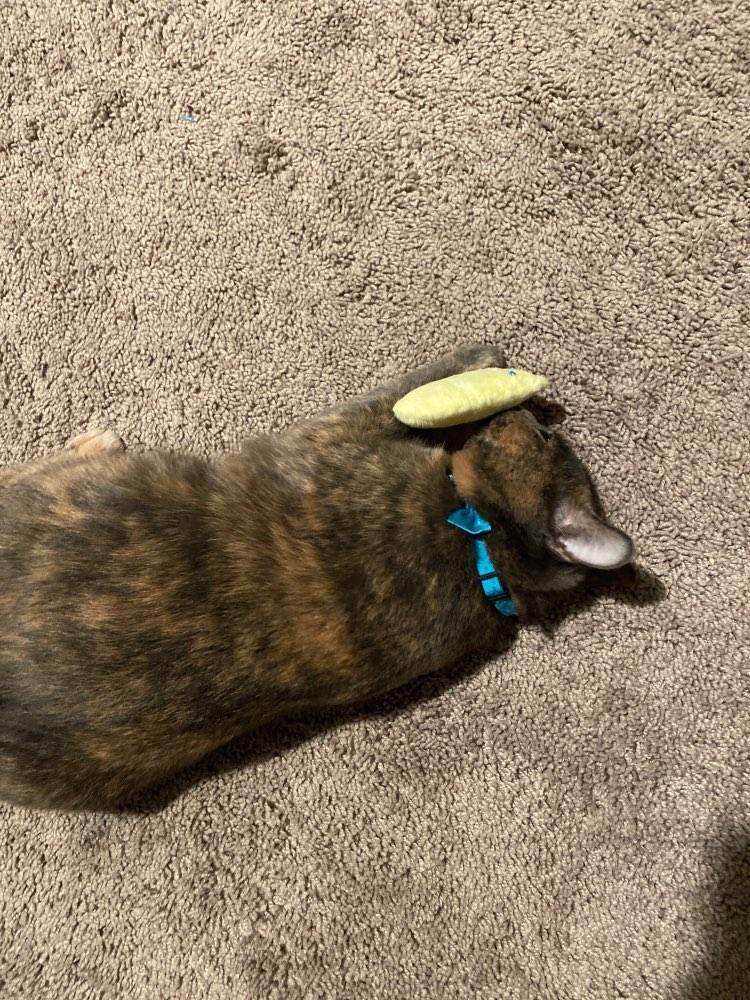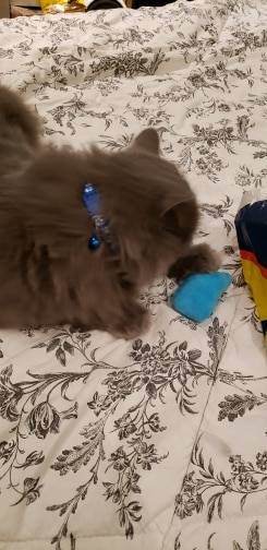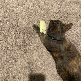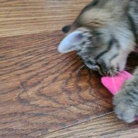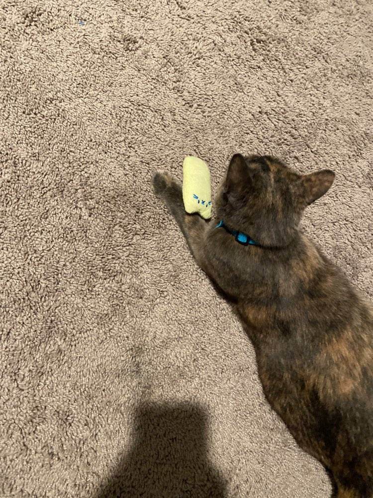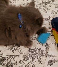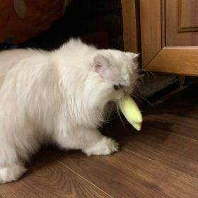 The cat really liked the toy, worn with it, plays. Inside the toy, something rustling, maybe a little cat’s ball. Total, take it!